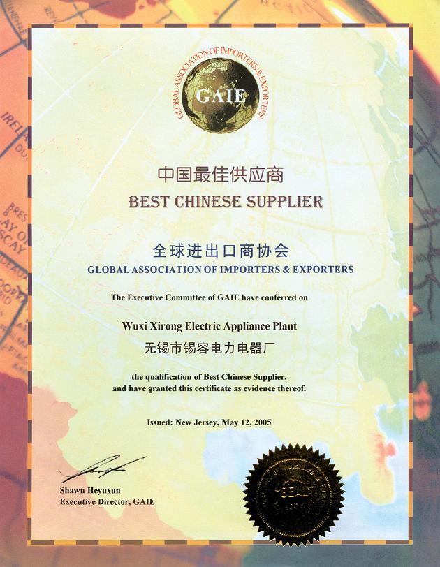 無錫市錫容電力電器有限公司,2005年,7月12號被全球進(jìn)出口商協(xié)會評為中國最佳供應(yīng)商。